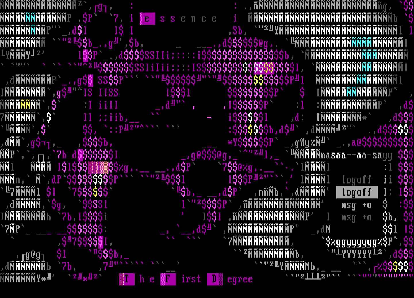l,gIS IISS ll P lP ,, :I iiII ,d , ,IP :l :P ,d7, ll iib, - il ,d: l* ,d, , ::P :b,d ,d .,d,d,g, ,b, *YP ,gy .,a@P,,,7b dl ,g@@g,l, nasaa--aa-sayy l llg,. .,dP 7@g,..ll :l n, ,dPP l lP. ll logoff ii 7l l 7 b, ,dP ,nb,,d logoff l: l ,d,g, SSl lP , msg +o :lb 7b,li ll ,P l msg +o b, 7P : , ,d ,P ,dN l l ,7I, 7, ggyyyyygP, ,g@g l b, b, YYYYYY,d,db 7b, ,7 YNb, ,Y* * T h e F irst D egree