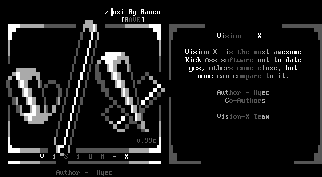 Vision X Vision-X is the most awesome Kick Ass software out to date yes, others come close, but none can compare to it. Author - Ryec Co-Authors Vision-X Team v.99c V i S i O N - X Author - Ryec