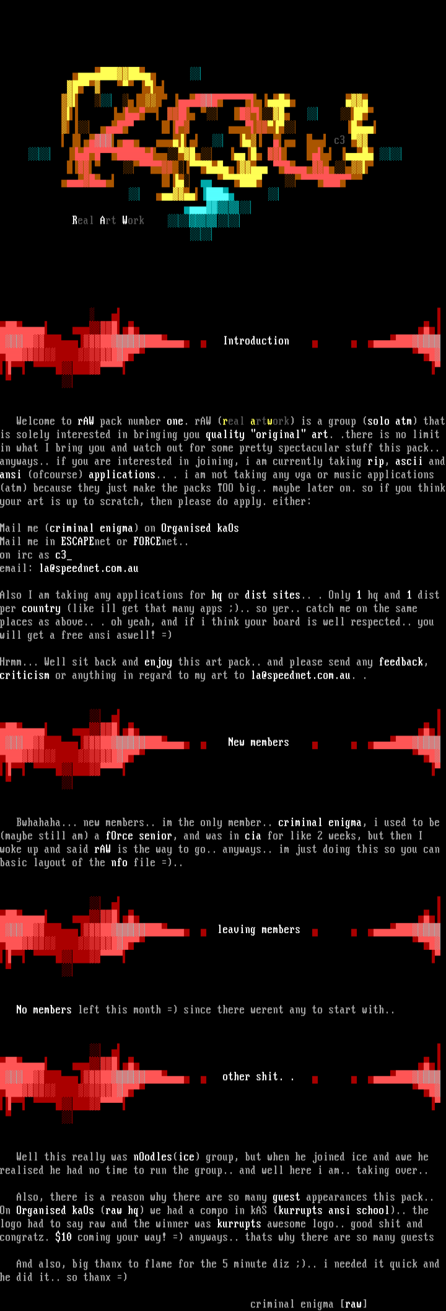 Welcome to rAW pack number one. rAW real artwork is a group solo atm thatis solely interested in bringing you quality original art. .there is no limit in what I bring you and watch out for some pretty spectacular stuff this pack.. anyways.. if you are interested in joining, i am currently taking rip, ascii andansi ofcourse applications.. . i am not taking any vga or music applications