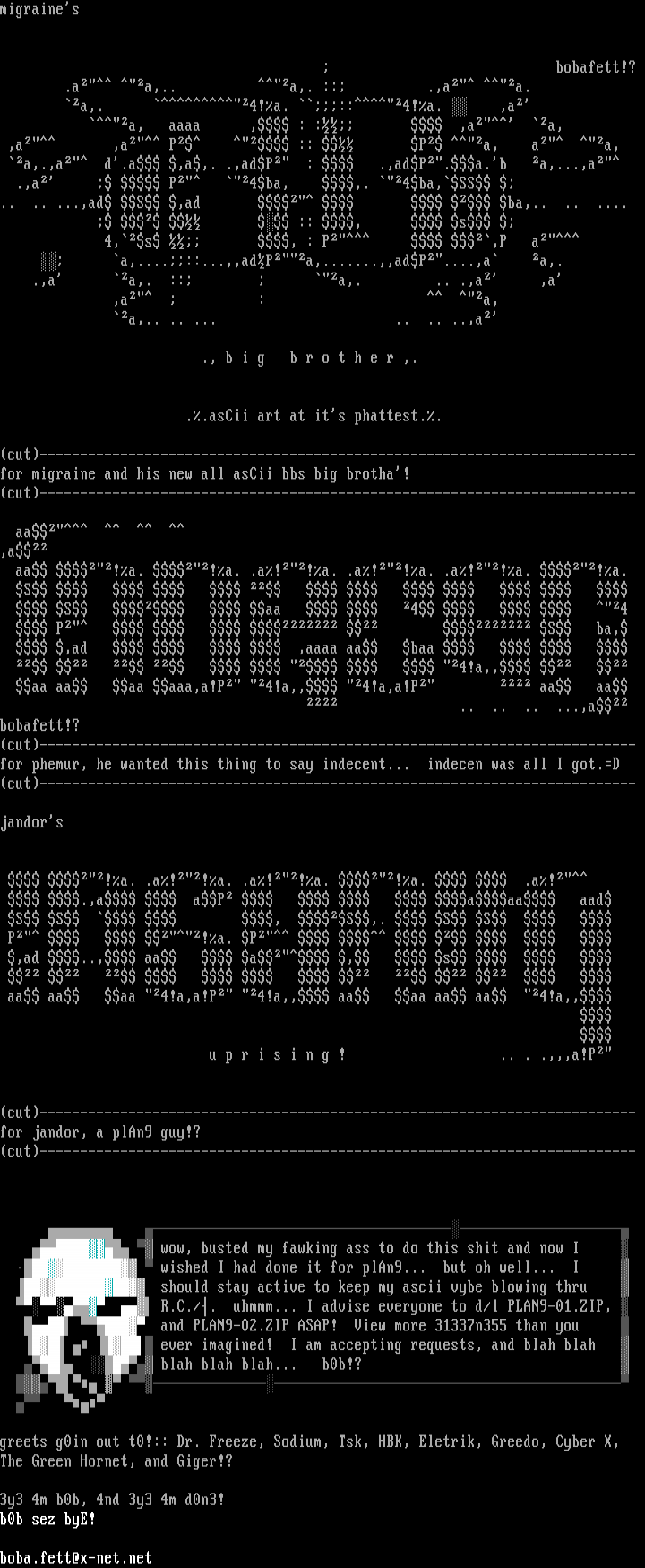 cut-------------------------------------------------------------------------- for migraine and his new all asCii bbs big brotha!