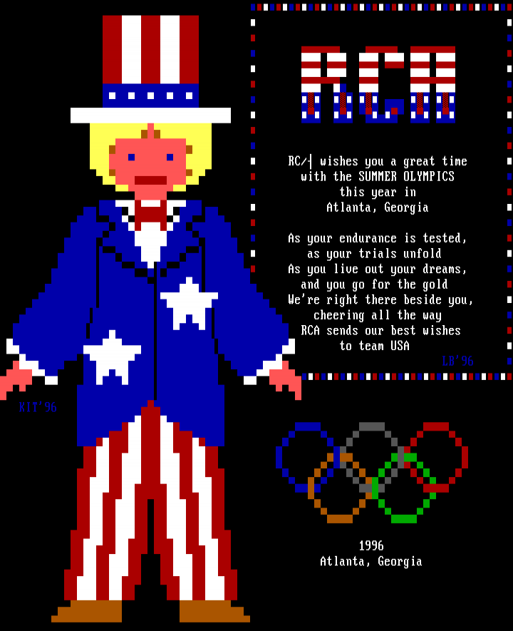 RC/ wishes you a great time with the SUMMER OLYMPICS this year in Atlanta, Georgia As your endurance is tested, as your trials unfold As you live out your dreams, and you go for the gold Were right there beside you, cheering all the way RCA sends our best wishes to team USA LB96
