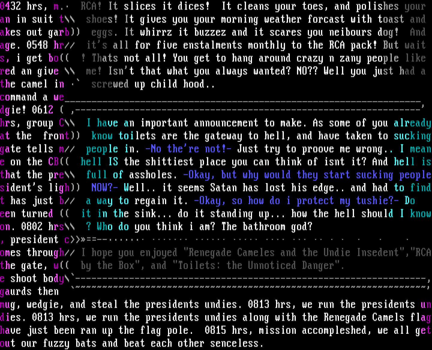 e shoot body-----------------------------------------------------------------,gaurds then mug, wedgie, and steal the presidents undies. 0813 hrs, we run the presidents undies. 0813 hrs, we run the presidents undies along with the Renegade Camels flaghave just been ran up the flag pole. 0815 hrs, mission accompleshed, we all getout our fuzzy bats and beat each other senceless.