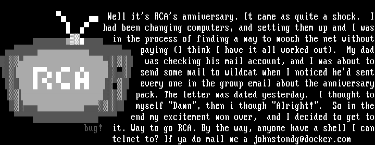 Well its RCAs anniversary. It came as quite a shock. I had been changing computers, and setting them up and I was in the process of finding a way to mooch the net without paying I think I have it all worked out. My dad was checking his mail account, and I was about to send some mail to wildcat when I noticed hed sent every one in the group email about the anniversary pack. The letter was dated yesterday. I thought to myself Damn, then i though Alright!. So in the end my excitement won over, and I decided to get to bug! it. Way to go RCA. By the way, anyone have a shell I can telnet to? If ya do mail me a johnstondg@docker.com
