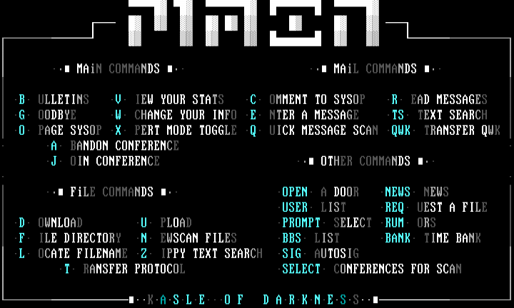 FiLE COMMANDS OPEN A DOOR NEWS NEWS USER LIST REQ UEST A FILE D OWNLOAD U PLOAD PROMPT SELECT RUM ORS F ILE DIRECTORY N EWSCAN FILES BBS LIST BANK TIME BANK L OCATE FILENAME Z IPPY TEXT SEARCH SIG AUTOSIG T RANSFER PROTOCOL SELECT CONFERENCES FOR SCAN KASLEO F D ARKNESS