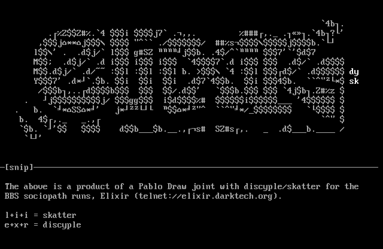 BBS sociopath runs, Elixir telnet://elixir.darktech.org.