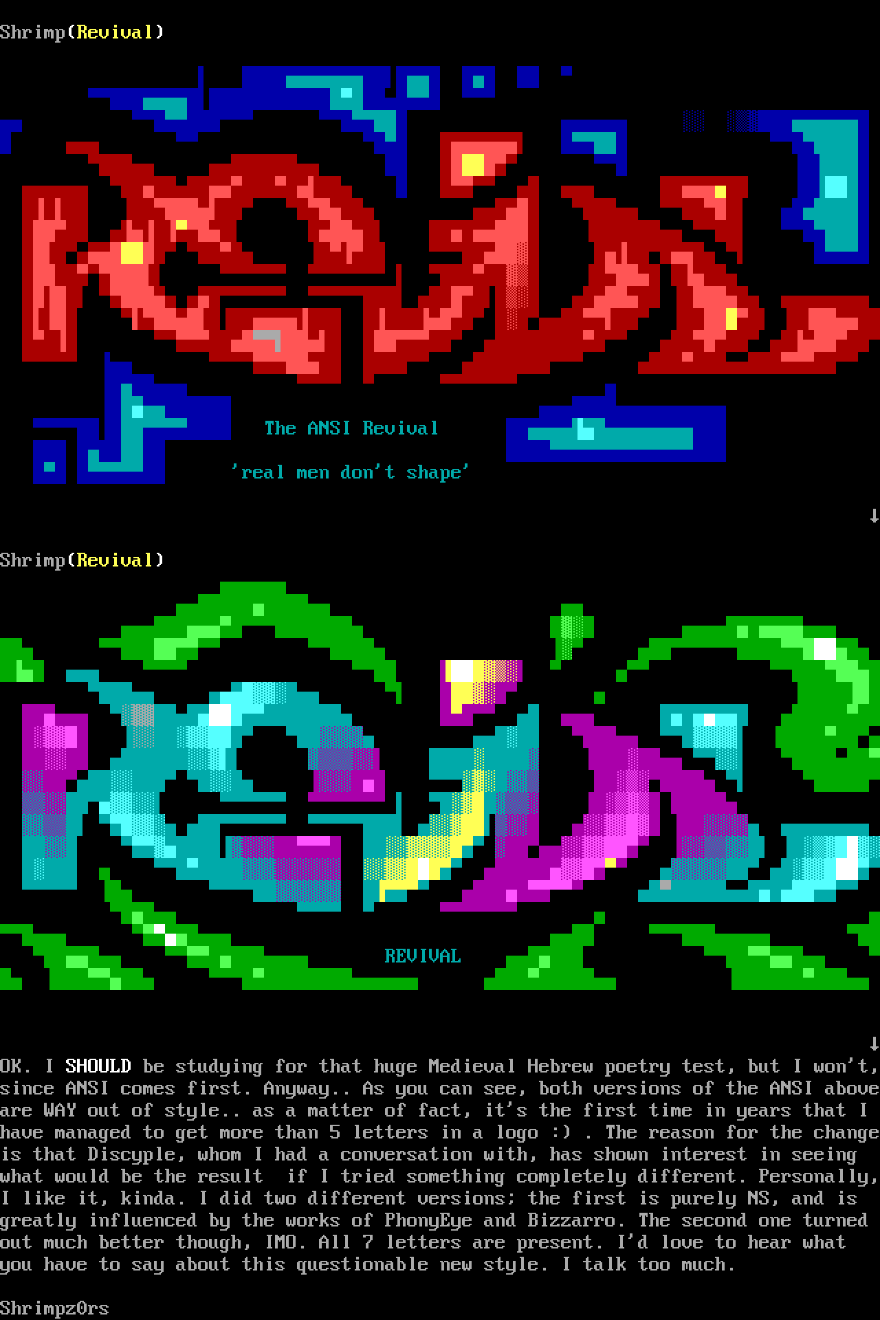 OK. I SHOULD be studying for that huge Medieval Hebrew poetry test, but I wont,since ANSI comes first. Anyway.. As you can see, both versions of the ANSI aboveare WAY out of style.. as a matter of fact, its the first time in years that I