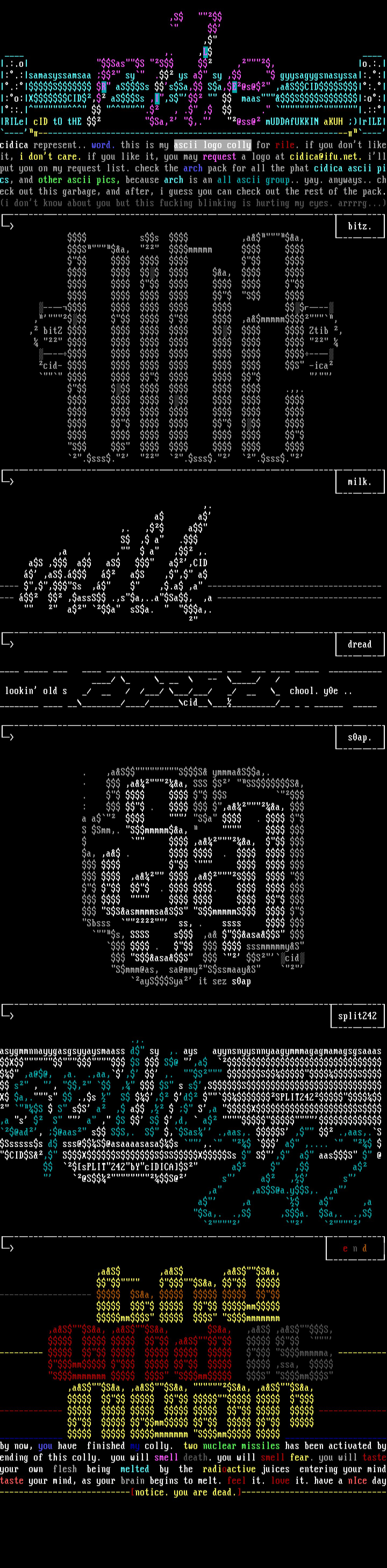 .:.o SasS S ,, o.:.:.:samasyssamsaa sy . ys a sy , gyysagygsnasyssa:.:.:S R aSSs sSa, Sa,E@s@ ,aSCIDS:.:o:XCID, aSSs ,I,S maasSS:o:::. . , . , . .::RILe cID tO tHE Sa, ,. @ss@ mUDDAfUKKIN aKUH rILE------------------------------------------------------------------------cidica represent.. word. this is my ascii logo colly for rile. if you dont likeit, i dont care. if you like it, you may request a logo at cidica@ifu.net. illput you on my request list. check the arch pack for all the phat cidica ascii pics, and other ascii pics, because arch is an all ascii group.. yay. anyways.. check out this garbage, and after, i guess you can check out the rest of the pack.i dont know about you but this fucking blinking is hurting my eyes. arrrrg...------------------------------------------------------- bitz. ss ,aa, ------ Sa, mmmmm