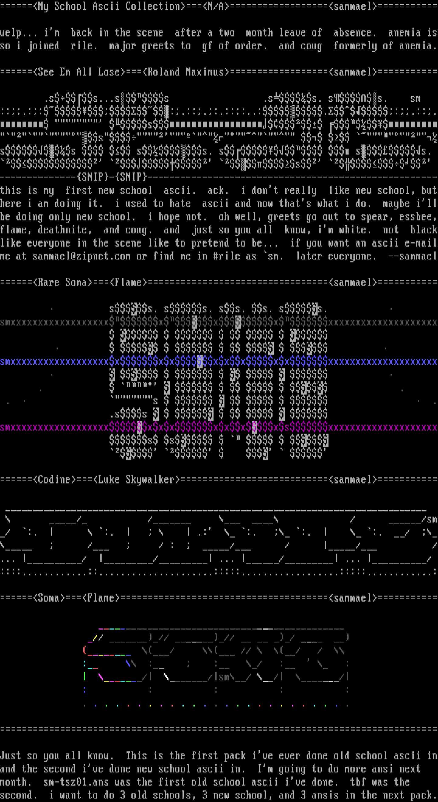 --------------SNIP-SNIP-----------------------------------------------------this is my first new school ascii. ack. i dont really like new school, buthere i am doing it. i used to hate ascii and now thats what i do. maybe illbe doing only new school. i hope not. oh well, greets go out to spear, essbee,flame, deathnite, and coug. and just so you all know, im white. not blacklike everyone in the scene like to pretend to be... if you want an ascii e-mailme at sammael@zipnet.com or find me in rile as sm. later everyone. --sammael