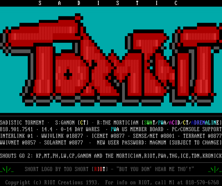 SADISTIC TORMENT S:GANON CT R:THE MORTICIAN SWAT/PWA/ACID/CT/ADRENALINE818.901.7541 14.4 0-14 DAY WARES PWA US MEMBER BOARD PC/CONSOLE SUPPORTINTERLINK @1 WWIVLINK @18877 ICENET @8877 SENSE/NET @8801 TERRANET @8877WWIVNET @8857 SOLARNET @8877 NEW USER PASSWORD: MAGNUM SUBJECT TO CHANGESHOUTS GO 2: KP,MT,PH,LW,CP,GANON AND THE MORTICIAN,RIOT,PWA,THG,ICE,TDN,KRONICK/ SHORT LOGO BY TOO SHORT RIOT - BUT YOU DON HEAR ME THO! / Copyright c RIOT Creations 1993. For info on RIOT, call MI at 818-570-6768