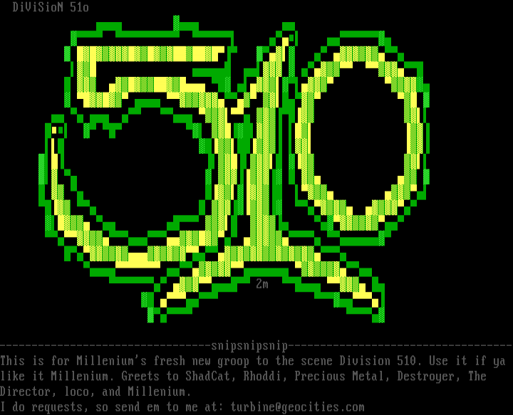 ---------------------------------snipsnipsnip-----------------------------------This is for Milleniums fresh new groop to the scene Division 510. Use it if ya