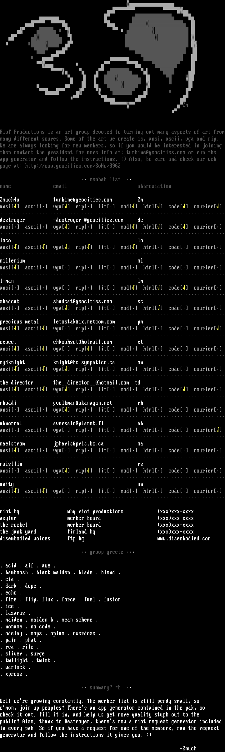 RioT Productions is an art group devoted to turning out many aspects of art frommany different soures. Some of the art we create is, ansi, ascii, vga and rip.