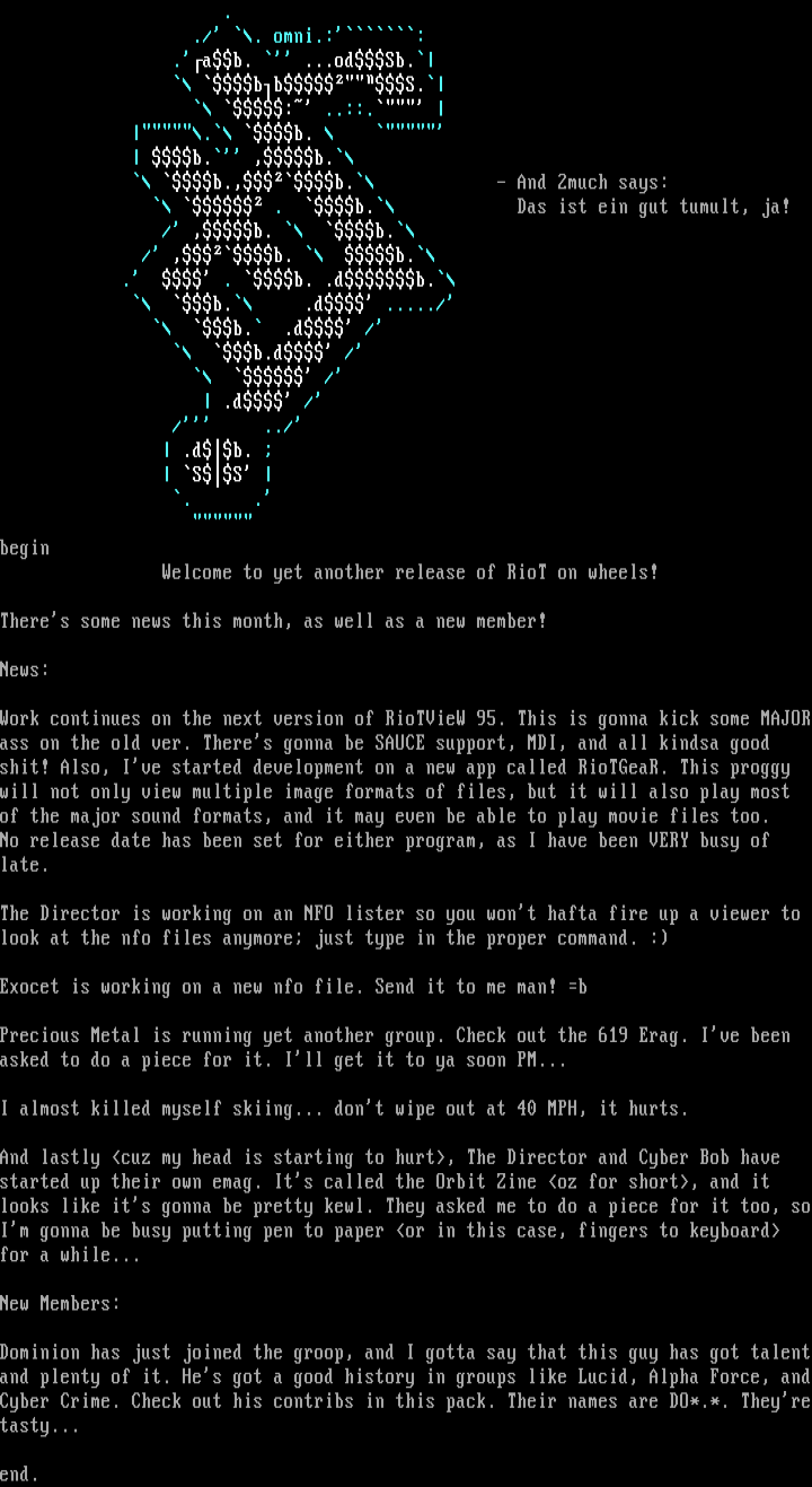 Work continues on the next version of RioTVieW 95. This is gonna kick some MAJORass on the old ver. Theres gonna be SAUCE support, MDI, and all kindsa good