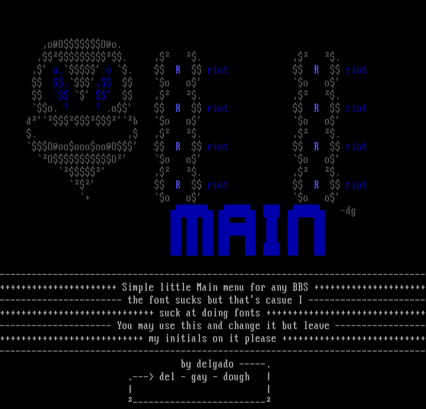 --------------------------------------------------------------------------------++++++++++++++++++++++ Simple little Main menu for any BBS +++++++++++++++++++++----------------------- the font sucks but thats casue I ----------------------+++++++++++++++++++++++++++++ suck at doing fonts ++++++++++++++++++++++++++++++--------------------- You may use this and change it but leave -----------------+++++++++++++++++++++++++++ my initials on it please +++++++++++++++++++++++++++-------------------------------------------------------------------------------- by delgado -----.