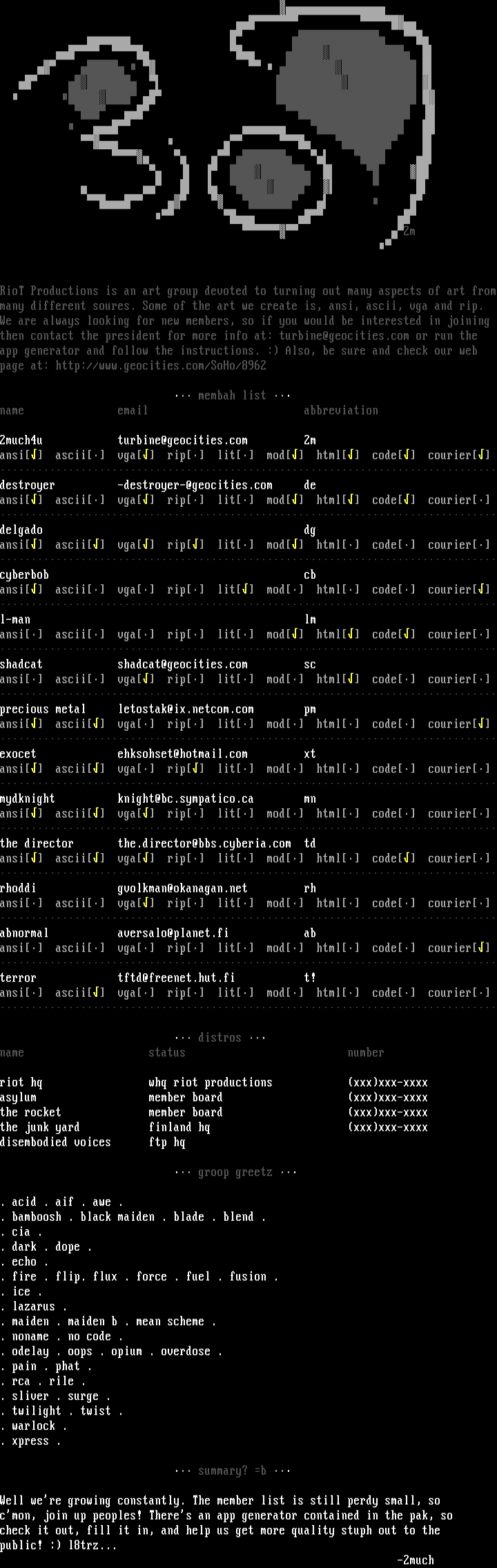 RioT Productions is an art group devoted to turning out many aspects of art frommany different soures. Some of the art we create is, ansi, ascii, vga and rip.