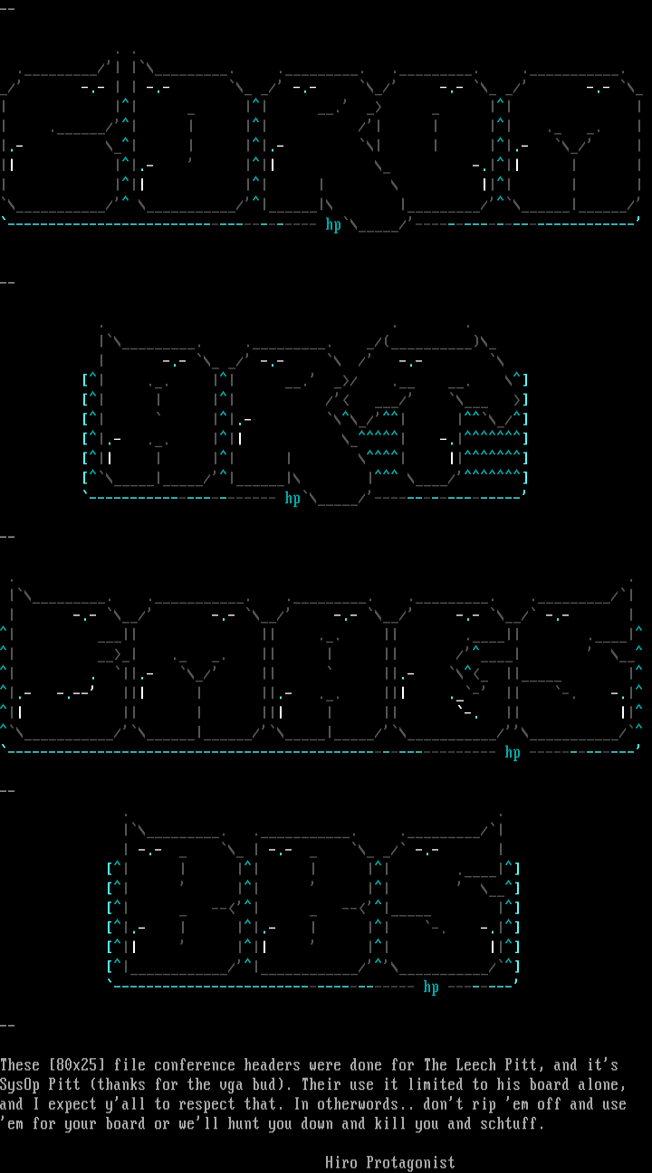 These 80x25 file conference headers were done for The Leech Pitt, and its