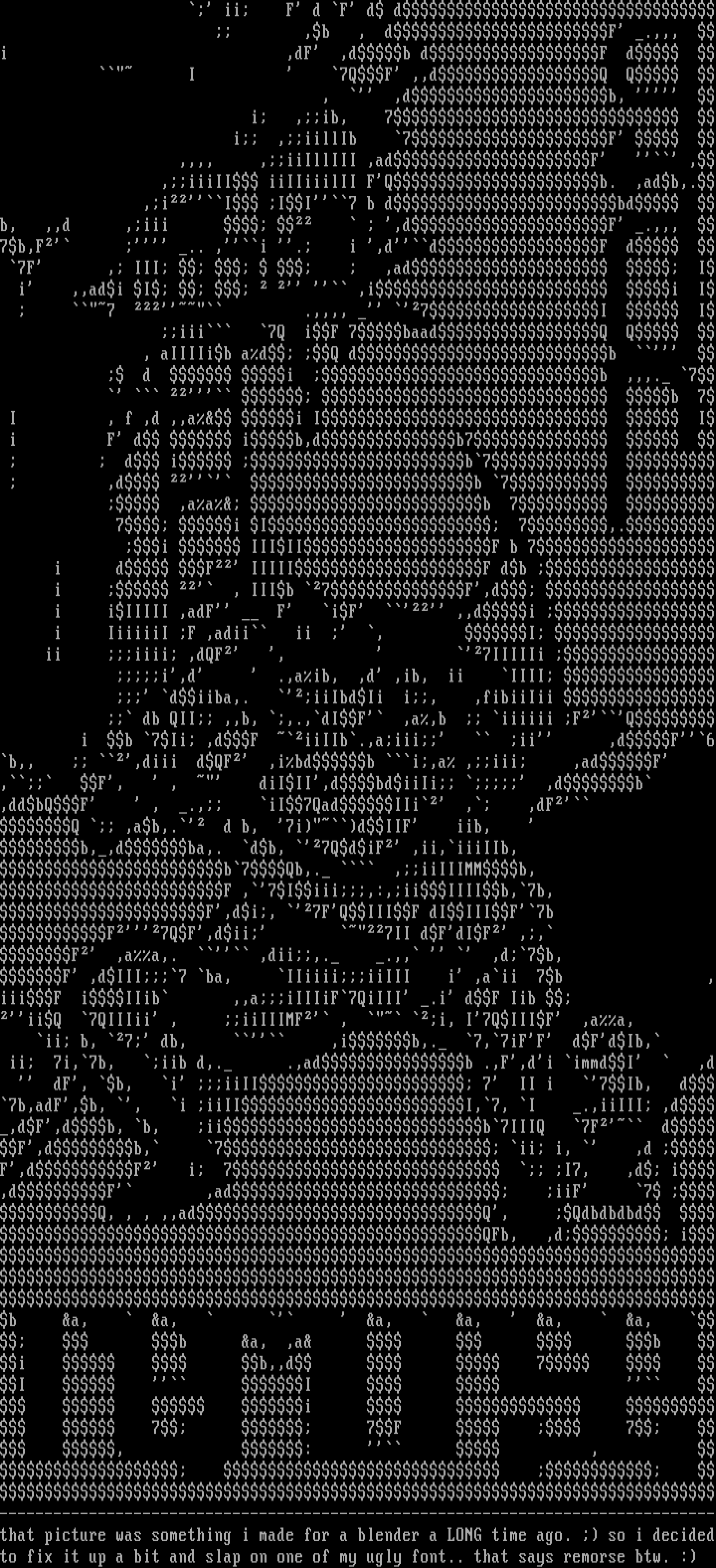 ii 7i,7b, iib d,. .,adb .,F,di immdI ,d dF, b, i iiII 7 II i 7Ib, d7b,adF,b, , i iiIII,7, I .,iiIII ,d,dF,db, b, iib7IIIQ 7F dF,db, 7 ii i, ,d F,dF i 7 I7, ,d i,dF ,ad iiF 7 Q, , , ,,adQ, Qdbdbdbd QFb, ,d ib a, a, a, a, a, a, b a, ,a b i b,,d 7 I I i 7 7F 7 , : , --------------------------------------------------------------------------------that picture was something i made for a blender a LONG time ago. so i decidedto fix it up a bit and slap on one of my ugly font.. that says remorse btw. :