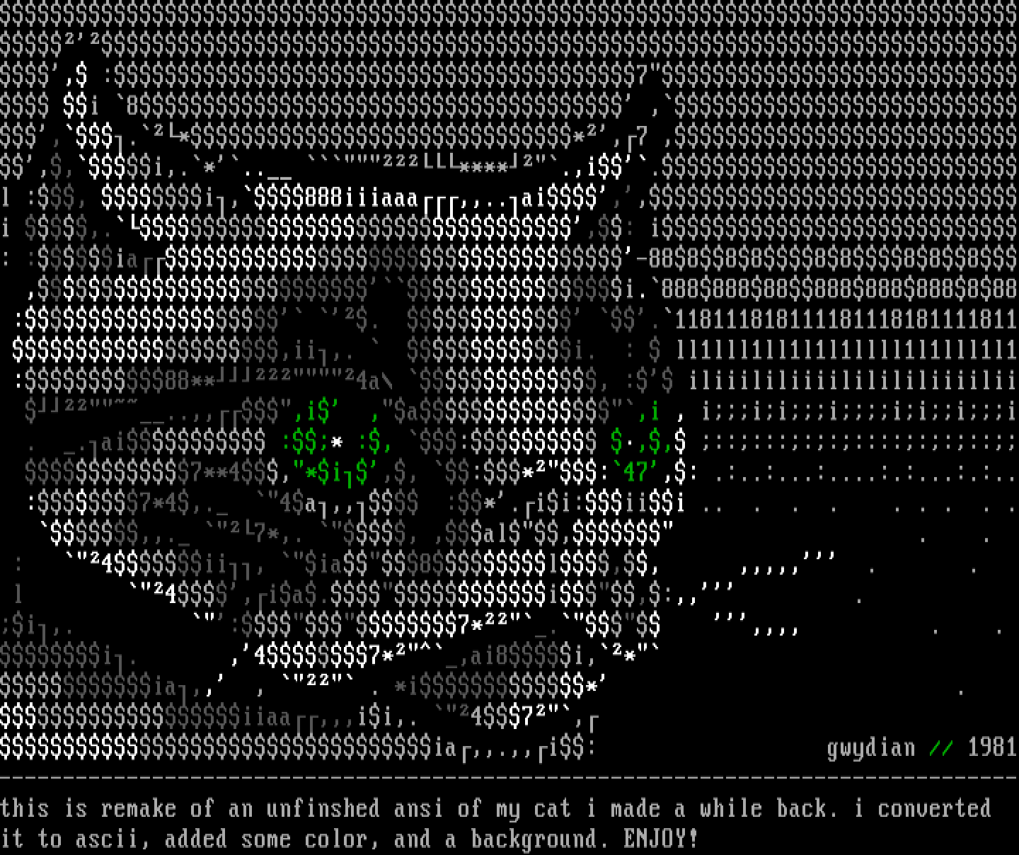 ia,,.,,i: gwydian // 1981--------------------------------------------------------------------------------this is remake of an unfinshed ansi of my cat i made a while back. i converted