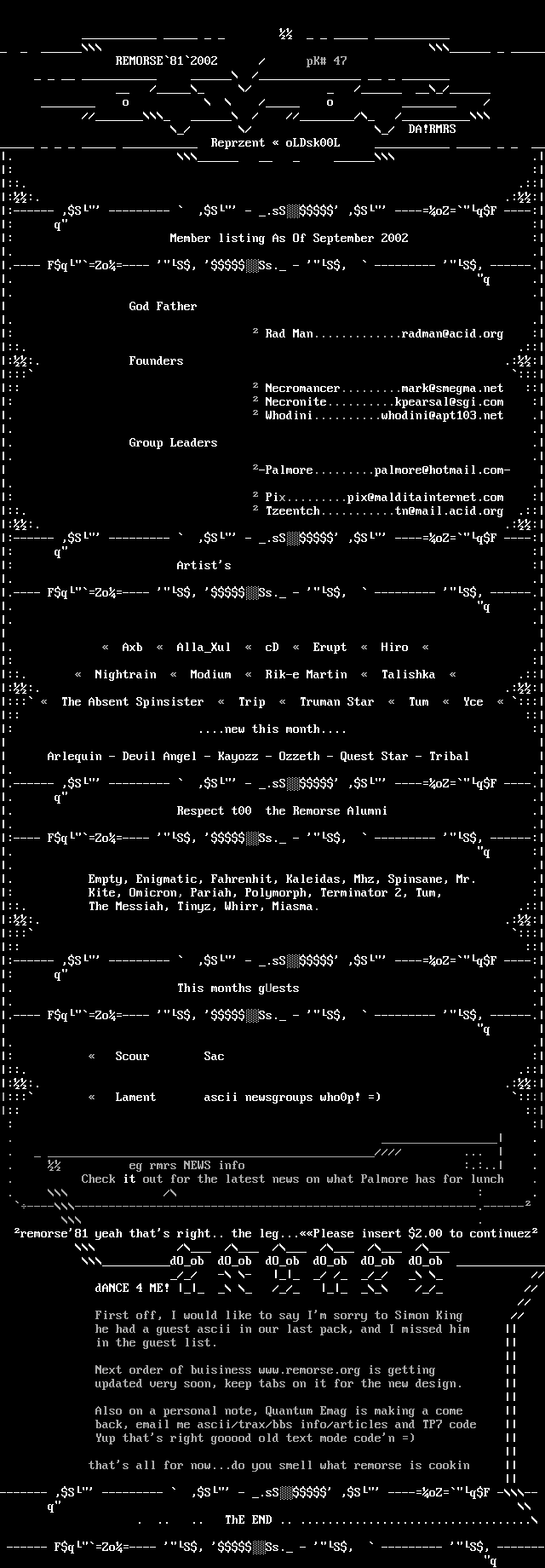 Reprzent oLDsk00L . .: :::. .::::. .:::------ ,S --------- ,S - .sS ,S ----oZqF ----:: q :: Member listing As Of September 2002 :. ..---- FqZo---- S, Ss. - S, --------- S, ------.. q .. . God Father . .: Rad Man.............radman@acid.org :::. .::::. Founders .::::: ::::: Necromancer.........mark@smegma.net ::: Necronite..........kpearsal@sgi.com :. Whodini..........whodini@apt103.net .. .. Group Leaders .. . -Palmore.........palmore@hotmail.com- . .: Pix.........pix@malditainternet.com :::. Tzeentch...........tn@mail.acid.org .::::. .:::------ ,S --------- ,S - .sS ,S ----oZqF ----:: q :: Artists :. ..---- FqZo---- S, Ss. - S, --------- S, ------.. q .. . . Axb AllaXul cD Erupt Hiro .: :::. Nightrain Modium Rik-e Martin Talishka .::::. .::::: The Absent Spinsister Trip Truman Star Tum Yce ::::: ::: ....new this month.... : Arlequin - Devil Angel - Kayozz - Ozzeth - Quest Star - Tribal . ..------ ,S --------- ,S - .sS ,S ----oZqF ----.. q .. Respect t00 the Remorse Alumni .. .:---- FqZo---- S, Ss. - S, --------- S, ------:. q :. .. Empty, Enigmatic, Fahrenhit, Kaleidas, Mhz, Spinsane, Mr. .: Kite, Omicron, Pariah, Polymorph, Terminator 2, Tum, :::. The Messiah, Tinyz, Whirr, Miasma. .::::. .::::: ::::: :::------ ,S --------- ,S - .sS ,S ----oZqF ----:: q .. This months gUests .. ..---- FqZo---- S, Ss. - S, --------- S, ------. q . .: Scour Sac :::. .::::. .::::: Lament ascii newsgroups who0p! ::::: :: : : . .