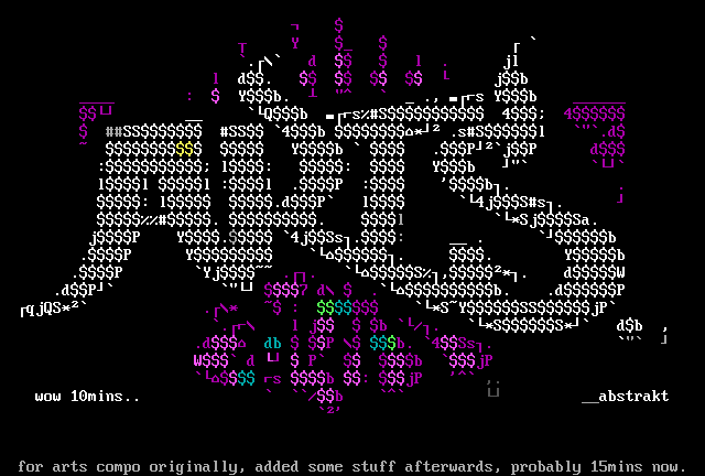 for arts compo originally, added some stuff afterwards, probably 15mins now.
