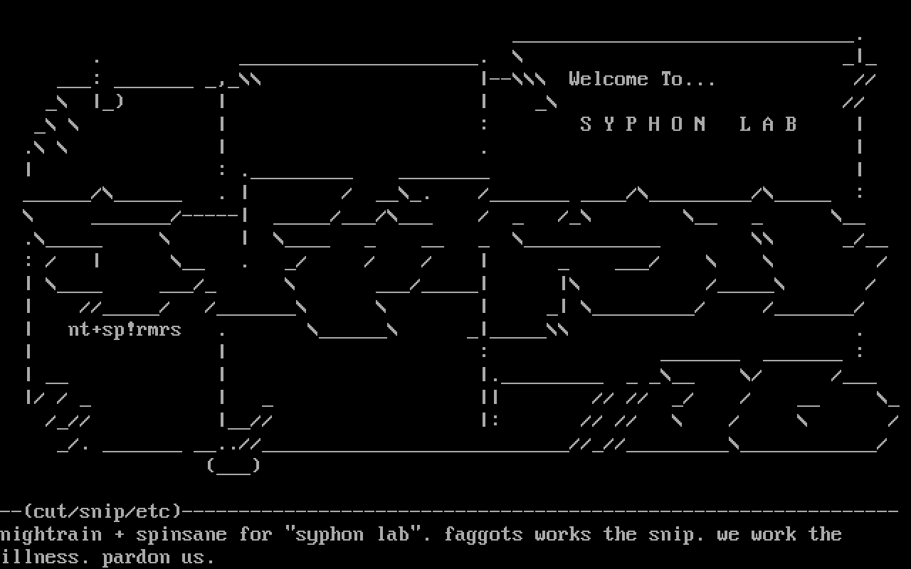 nightrain + spinsane for syphon lab. faggots works the snip. we work the