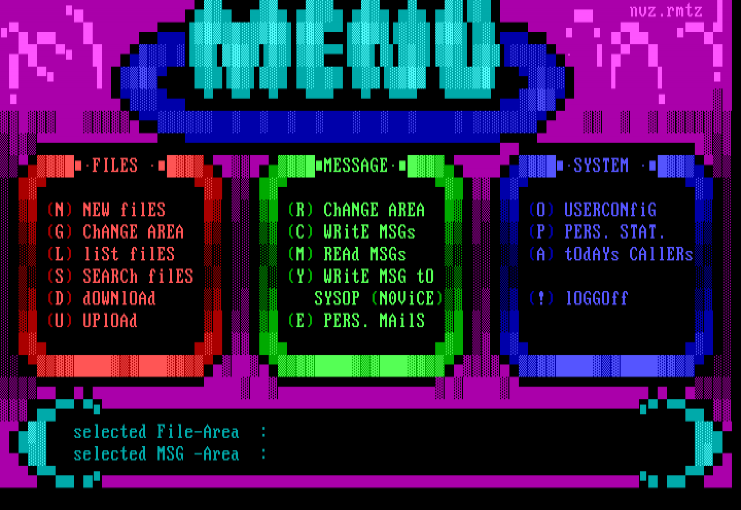 N NEW filES R ChANGE AREA O USERCONfiG G ChANGE AREA C WRitE MSGs P PERS. STAT.