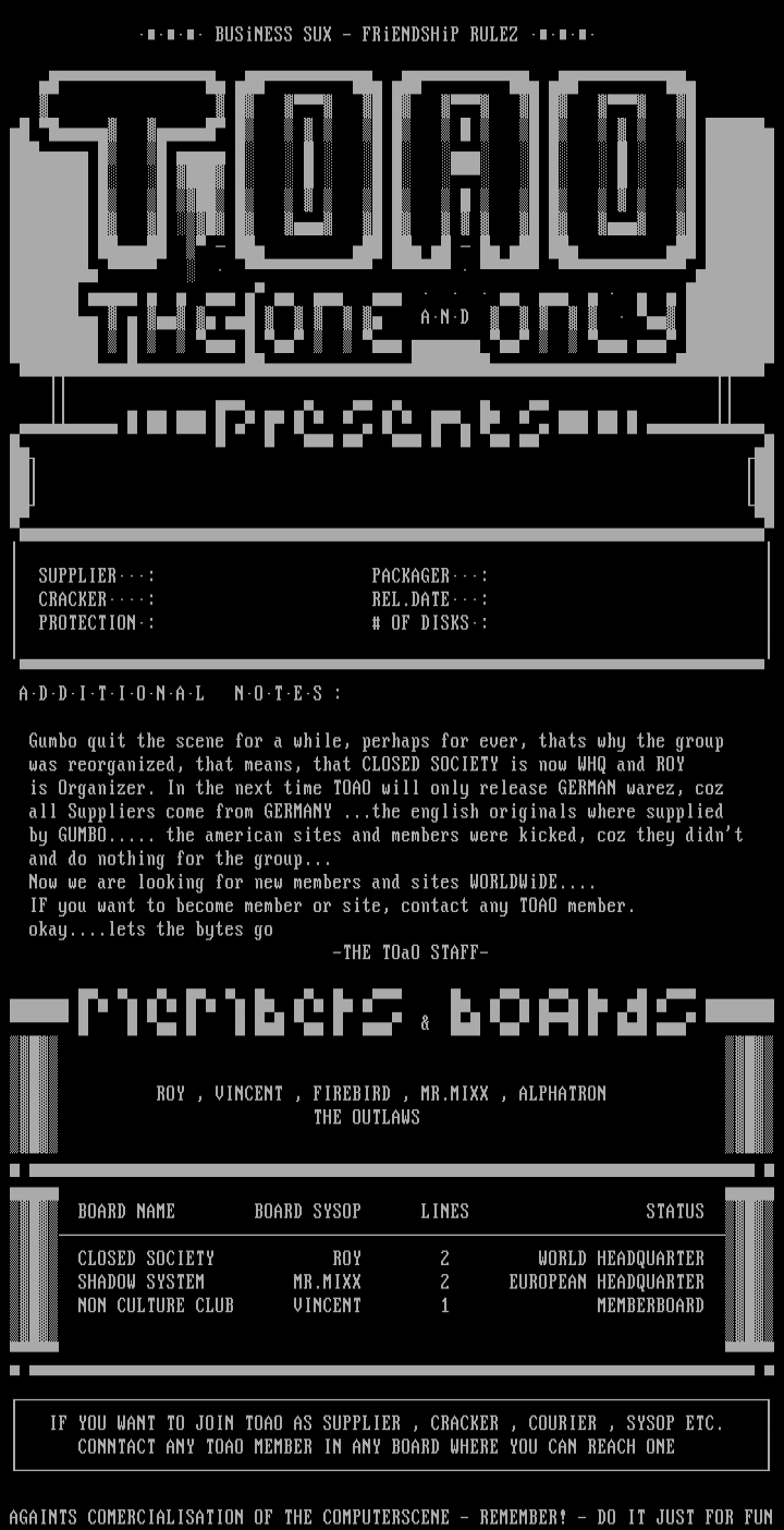 AGAINTS COMERCIALISATION OF THE COMPUTERSCENE - REMEMBER! - DO IT JUST FOR FUN