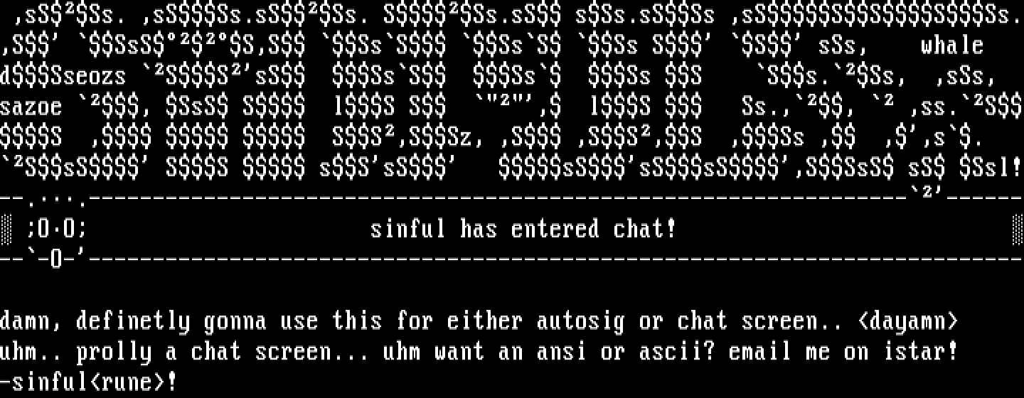 uhm.. prolly a chat screen... uhm want an ansi or ascii? email me on istar!