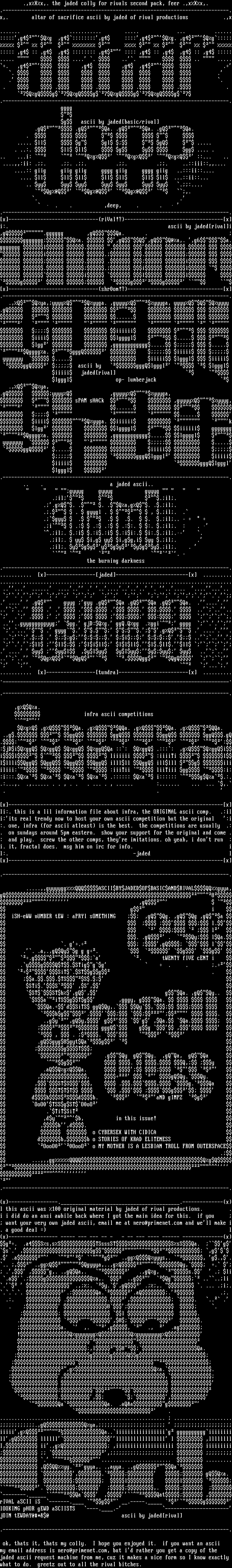 x-----------------..--------------xl this ascii was 100 original material by jaded of rival productions. .i i did do an ansi awhile back where I got the main idea for this. if you