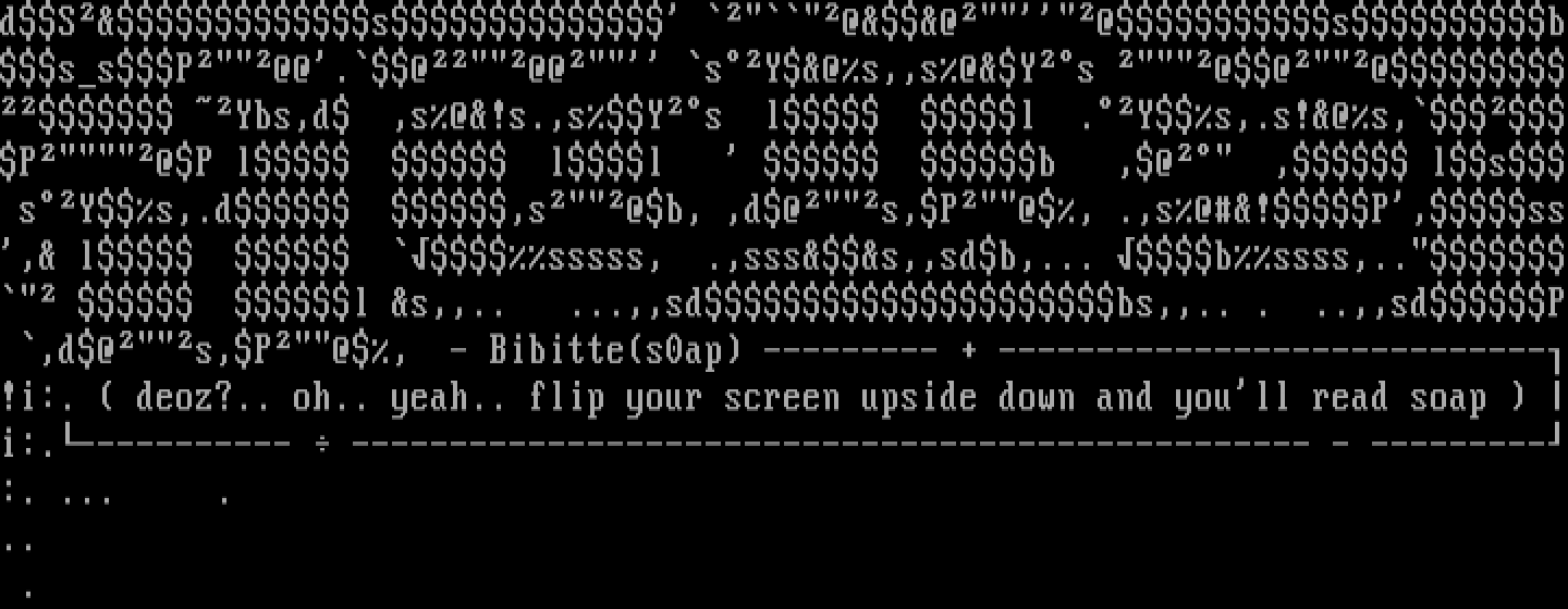 dSs @@@sbssP@@.@@@ sY@s,,s@Ys @@@ Ybs,d ,s@!s.,sYs l l .Ys,.s!@s,P@P l ll b ,@ , ls sYs,.d ,s@b, ,d@s,P@, .,s@!P,ss, l sssss, .,ssss,,sdb,... bssss,.. l s,,.. ...,,sdbs,,.. . ..,,sdP ,d@s,P@, - Bibittes0ap --------- + ----------------------------!i:. deoz?.. oh.. yeah.. flip your screen upside down and youll read soap i:.----------- ------------------------------------------------- - ---------:. ... .
