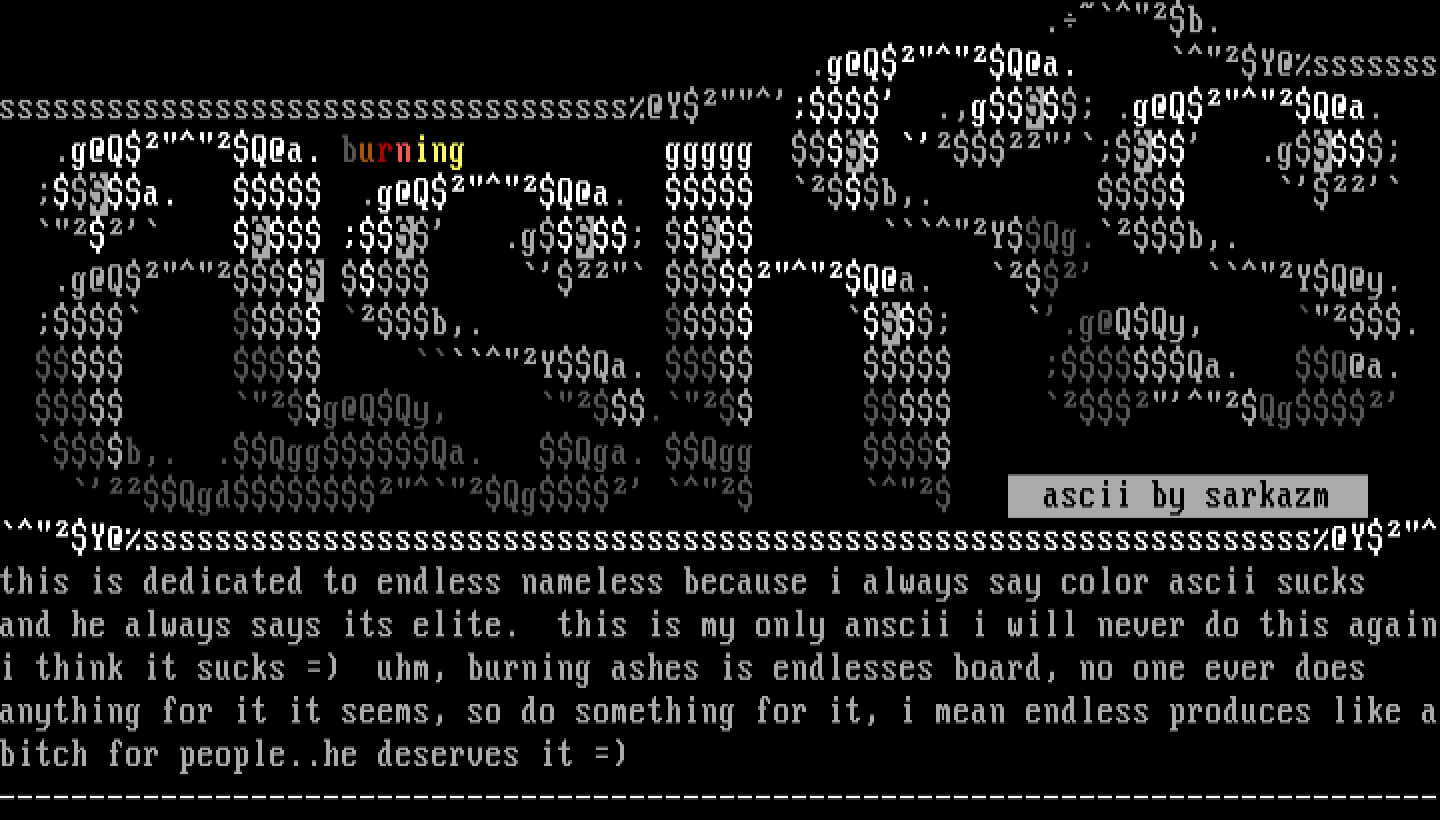 and he always says its elite. this is my only anscii i will never do this againi think it sucks uhm, burning ashes is endlesses board, no one ever does