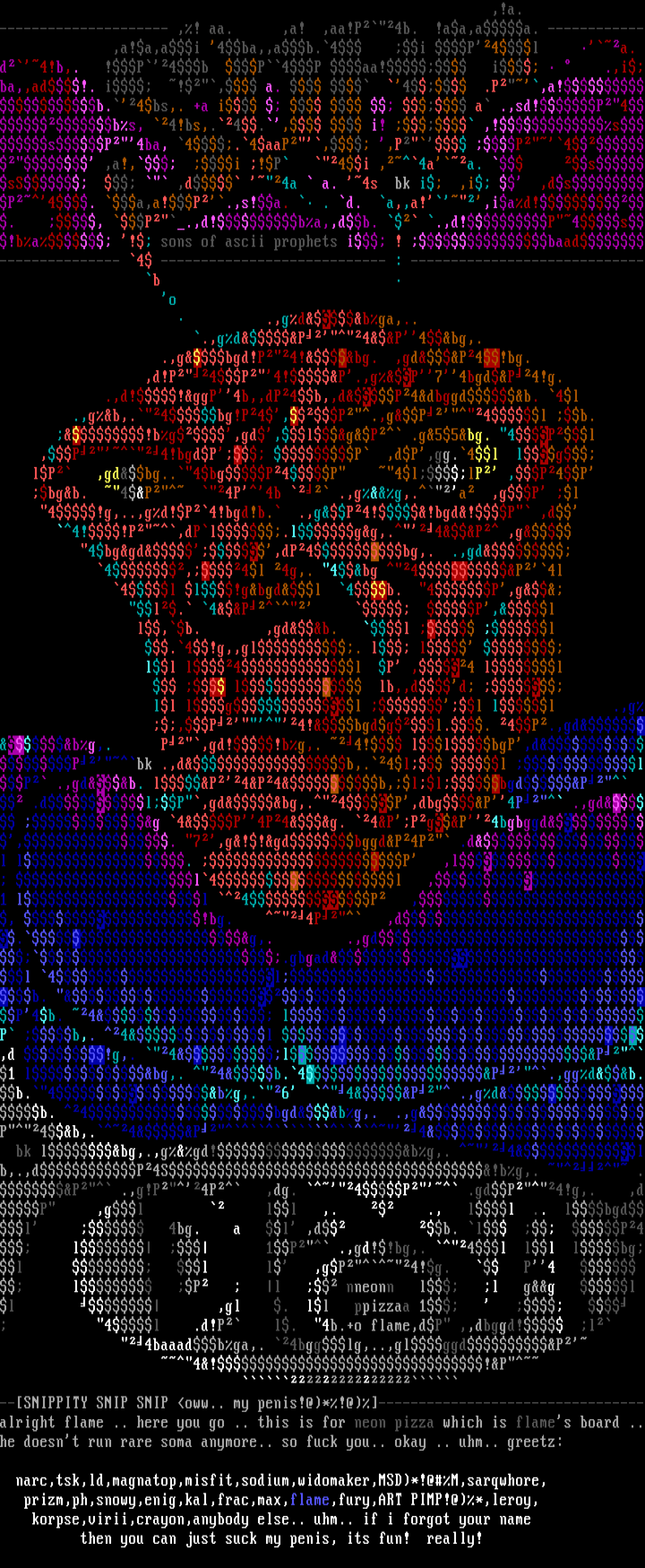 --SNIPPITY SNIP SNIP oww.. my penis!@*!@---------------------------------alright flame .. here you go .. this is for neon pizza which is flames board ..he doesnt run rare soma anymore.. so fuck you.. okay .. uhm.. greetz: