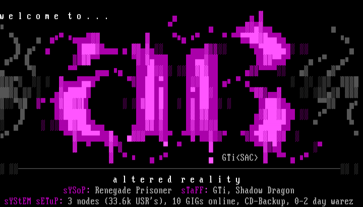 sYStEM sETuP: 3 nodes 33.6k USRs, 10 GIGs online, CD-Backup, 0-2 day warez