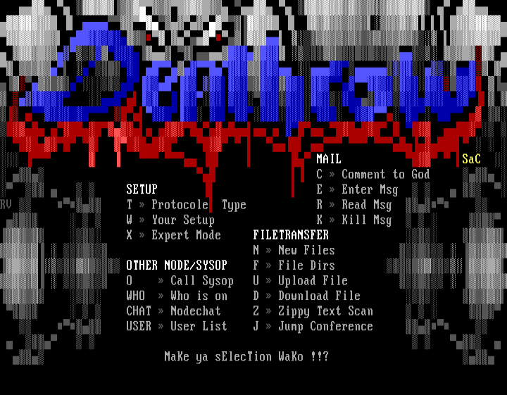 MAIL SaC C Comment to God SETUP E Enter Msg RV T Protocole Type R Read Msg W Your Setup K Kill Msg X Expert Mode FILETRANSFER N New Files