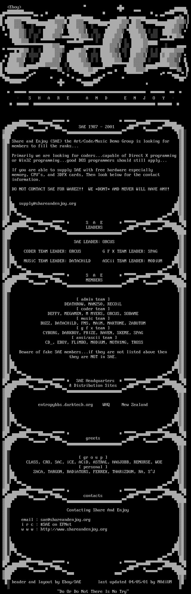 DO NOT CONTACT SAE FOR WAREZ!! WE *DONT* AND NEVER WILL HAVE ANY!