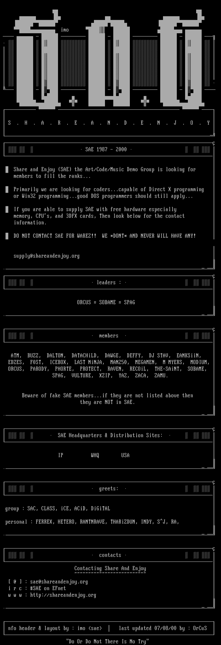 Share and Enjoy SAE the Art/Code/Music Demo Group is looking for