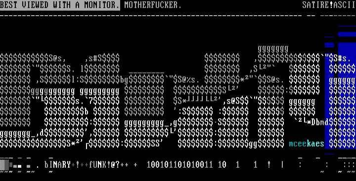 BEST VIEWED WITH A MONITOR. MOTHERFUCKER. SATIRE!ASCII-------------------------------------------------------------------- -- -------- ggggggg