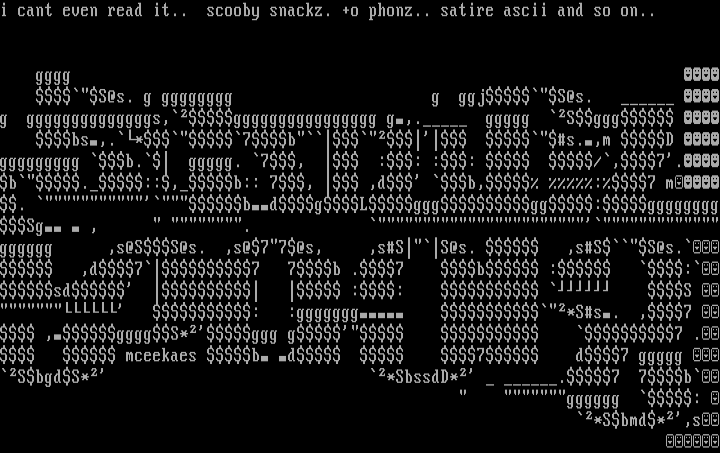 i cant even read it.. scooby snackz. +o phonz.. satire ascii and so on..