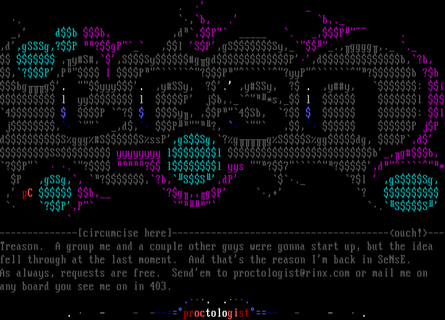 As always, requests are free. Sendem to proctologist@rinx.com or mail me on