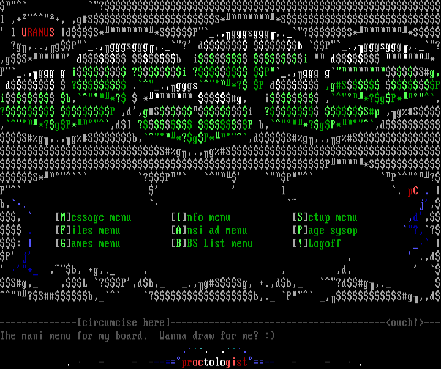 P.,ggg g i ?i ? P.,ggg gSg, d ? ..,gggs*? P d ,gS Pi b,*? * g, i ,*?gP*,? P ,d,gSi ? Sp ,gS,*?gP*,dl ? P b,*?gP*,dSg,.,gSb,*?gP*,dSg,.,gSSg,.,gSP*SS* ?P P P?P l . pC . lb,. j,, Message menu Info menu Setup menu ,d, . Files menu Ansi ad menu Page sysop ?,?: l Games menu BBS List menu !Logoff lP j , .,d + ,b, +g,. , , ,d, Sg, ,L ?P,db, .,gSSg, +.,db, ?dg,. ?Sb, ?b,. P ,Sg,,d