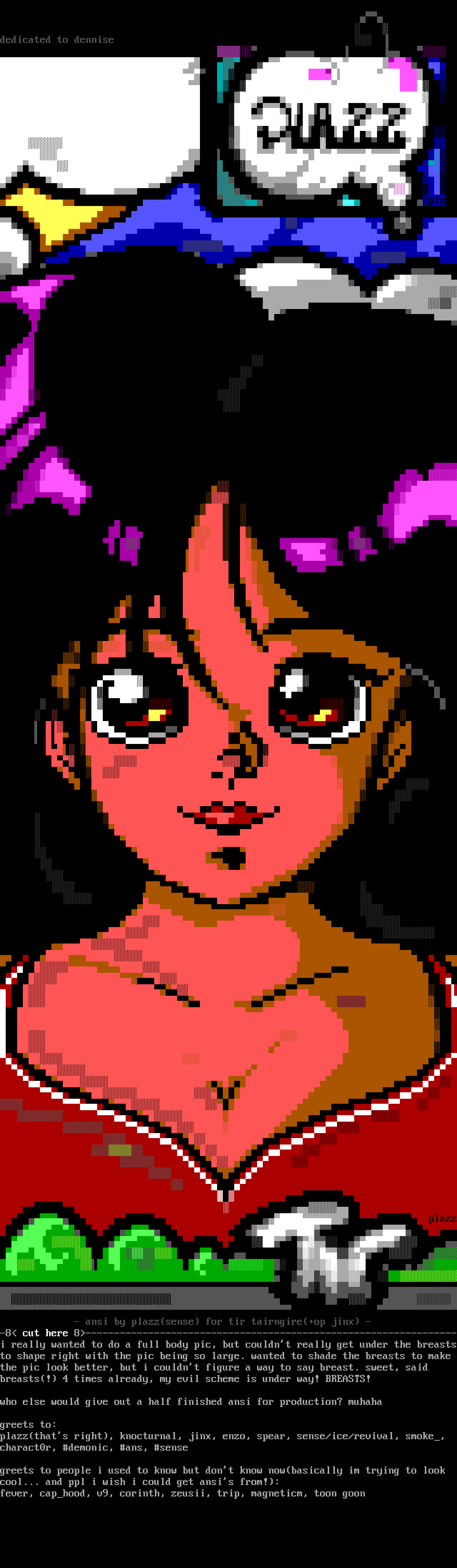 - ansi by plazzsense for tir tairngire+op jinx - -8 cut here 8-----------------------------------------------------------------i really wanted to do a full body pic, but couldnt really get under the breaststo shape right with the pic being so large. wanted to shade the breasts to make the pic look better, but i couldnt figure a way to say breast. sweet, said breasts! 4 times already, my evil scheme is under way! BREASTS! who else would give out a half finished ansi for production? muhaha greets to: plazzthats right, knocturnal, jinx, enzo, spear, sense/ice/revival, smoke, charact0r, demonic, ans, sense greets to people i used to know but dont know nowbasically im trying to look cool... and ppl i wish i could get ansis from!: fever, caphood, v9, corinth, zeusii, trip, magneticm, toon goon