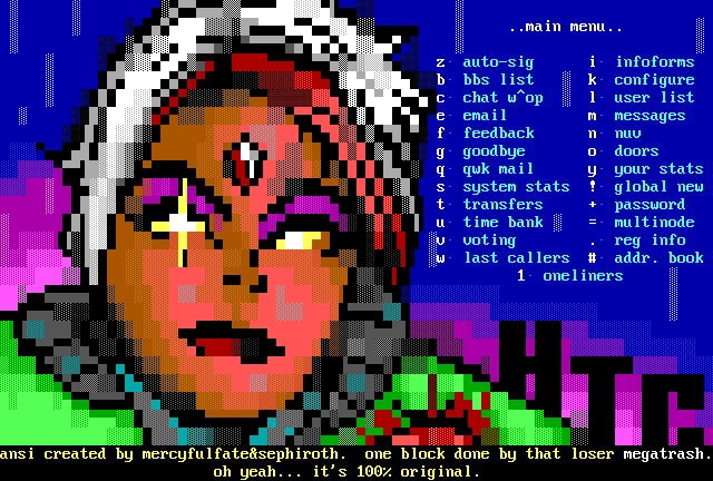 ..main menu.. z auto-sigi infoforms b bbs listk configure c chat wopl user list e emailm messages f feedbackn nuv g goodbyeo doors q qwk maily your stats s system stats! global new t transfers+ password u time bank multinode v voting. reg info w last callers addr. book 1 oneliners ansi created by mercyfulfatesephiroth. one block done by that loser megatrash. oh yeah... its 100 original.