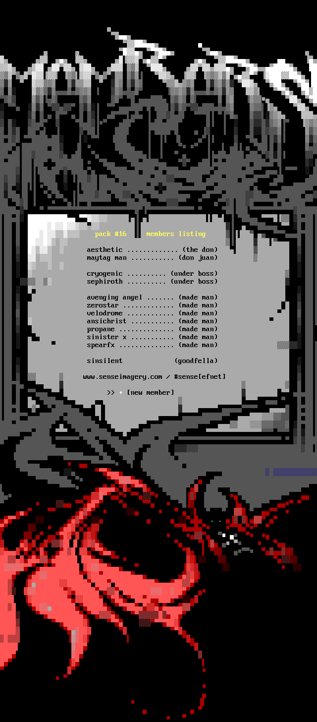 pack 16 members listing aesthetic ............. the don maytag man ........... don juan cryogenic ..........under boss sephiroth ..........under boss avenging angel ....... made man zerostar ............. made man velodrome ............ made man ansichrist ........... made man propane .............. made man