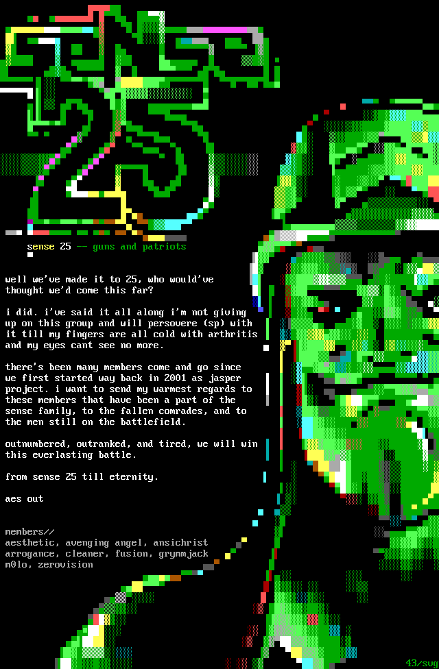 i did. ive said it all along im not giving up on this group and will persovere sp with it till my fingers are all cold with arthritis and my eyes cant see no more. theres been many members come and go since we first started way back in 2001 as jasper project. i want to send my warmest regards to these members that have been a part of the sense family, to the fallen comrades, and to the men still on the battlefield. outnumbered, outranked, and tired, we will win this everlasting battle. from sense 25 till eternity. aes out members// aesthetic, avenging angel, ansichrist arrogance, cleaner, fusion, grymmjack m0lo, zerovision