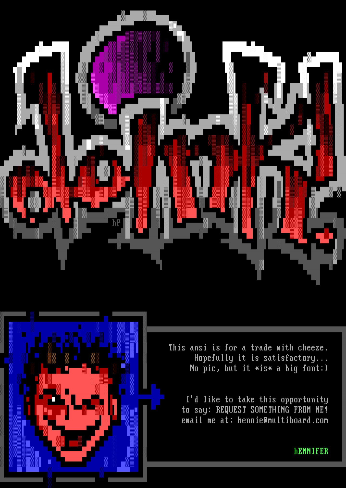 This ansi is for a trade with cheeze. Hopefully it is satisfactory... No pic, but it *is* a big font: Id like to take this opportunity to say: REQUEST SOMETHING FROM ME! email me at: hennie@multiboard.com hENNIFER
