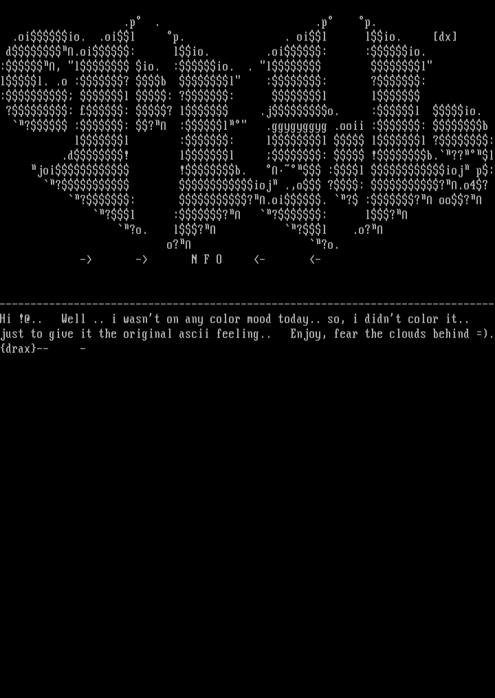 just to give it the original ascii feeling.. Enjoy, fear the clouds behind .drax-- -