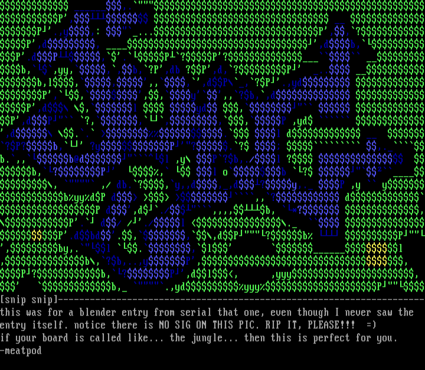 ,.P, P.,y,: ...P,,?P,d, ,db,P.dP,.P?P? b,,yy,,,b,?P,db ?P,d,?P .. b,l,,,,,,dP,?P.,yd P,,,,y,,?b,,d P,d ,l yd , P,dP ?,,,,,P ,yd ,d .. . l d ?P?b, ?yP?.? ,.b.,,b@dl ,y P?b,./l ? b,?P , l ob ? , ,/ db.?,y,,d,,d?y,. P ,y ybyydP d ,,? dP d,d./,,,,b, *? ,P. d/ /./l . P.dbd.,,,dP?b P,by,.l .,l l ,b,?b,..,yP,, P?b,?P,dl, ,yyy, b, .,ydyyyPsnip snip---------------------------------------------------------------------this was for a blender entry from serial that one, even though I never saw the