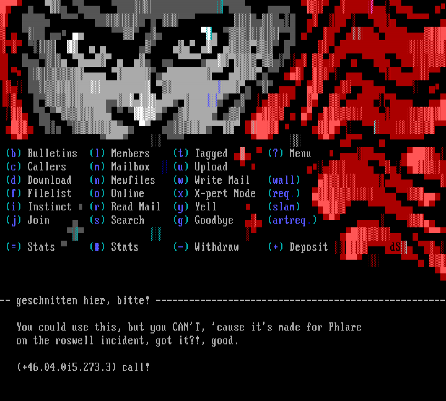 b Bulletins l Members t Tagged ? Menu c Callers m Mailbox u Upload d Download n Newfiles w Write Mail wall