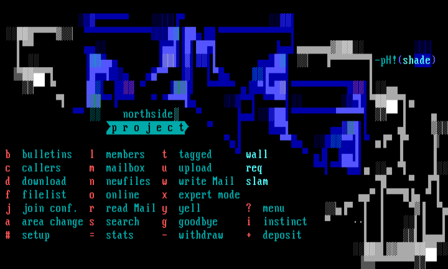 j join conf. r read Mail y yell ? menu a area change s search g goodbye i instinct setup stats - withdraw + deposit