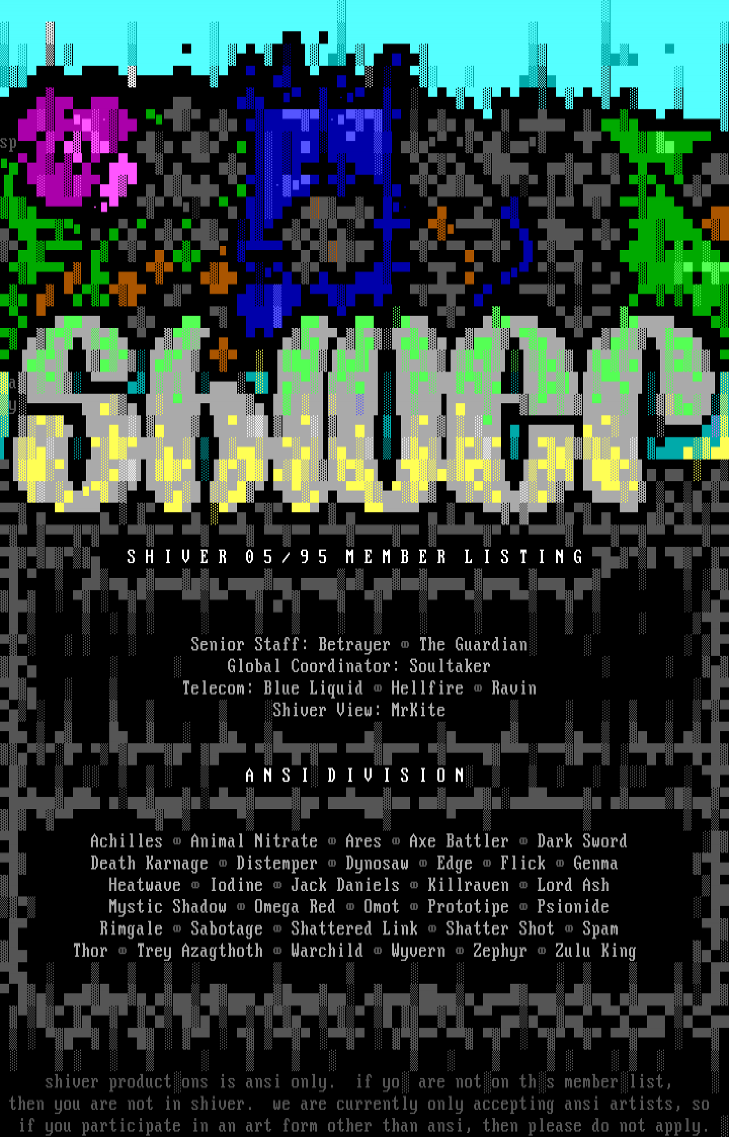 a y S H I V E R 0 5 / 9 5 M E M B E R L I S T I N G Senior Staff: Betrayer The Guardian Global Coordinator: Soultaker Telecom: Blue Liquid Hellfire Ravin Shiver View: MrKite A N S I D I V I S I O N Achilles Animal Nitrate Ares Axe Battler Dark Sword Death Karnage Distemper Dynosaw Edge Flick Genma Heatwave Iodine Jack Daniels Killraven Lord Ash Mystic Shadow Omega Red Omot Prototipe Psionide Rimgale Sabotage Shattered Link Shatter Shot Spam Thor Trey Azagthoth Warchild Wyvern Zephyr Zulu King