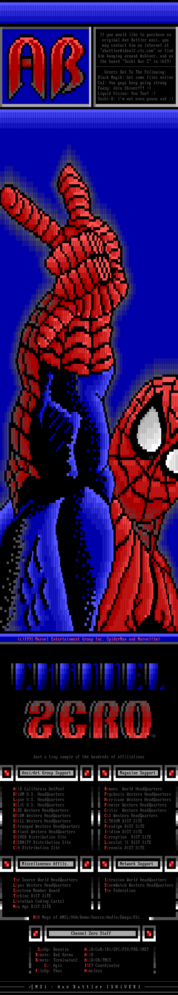 If you would like to purchase an original Axe Battler ansi, you may contact him on internet at abattler@ideal2.cts.com or find him hanging around shiver, and on the board Sushi Bar Z in 619 Greets Out To The Following: Black Magik: Get some files online CoJ: You guys keep going strong Faazy: Join Shiver!!! Liquid Vision: You Too! : Sushi-X: Im not even gonna ask